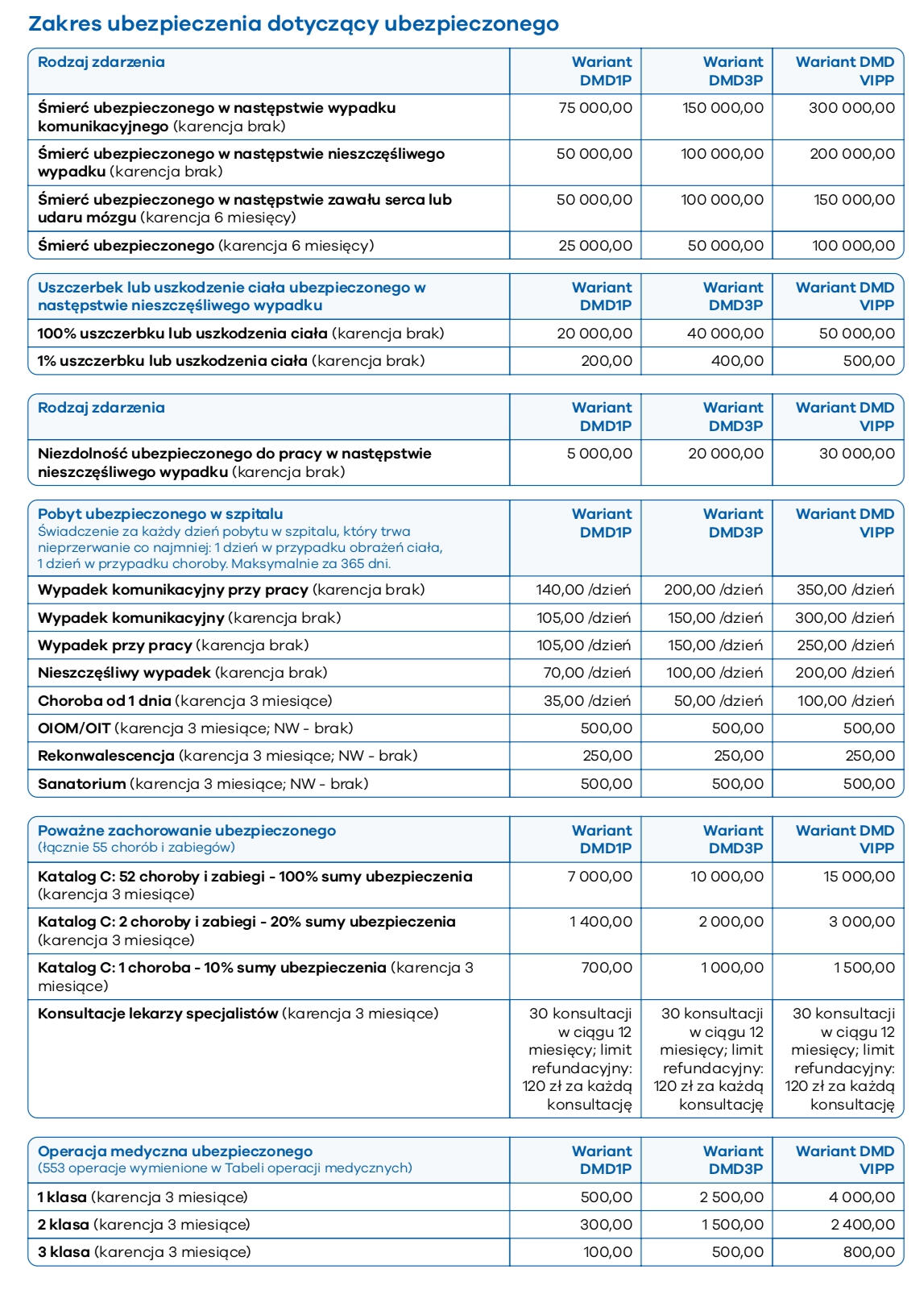 ✓ Śmierć w wypadku komunikacyjnym✓ Uszczerbek lub uszkodzenie ciała (progresja do 400%)✓ Pobyt w szpitalu po wypadku