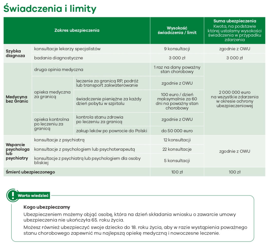 Wsparcie finansowe w razie nowotworu: do 15 000 zł za rozpoznanie, 60 zł/dzień hospitalizacji, 2 000 zł na leczenie specjalistyczne (chemioterapia, radioterapia, terapia celowana).