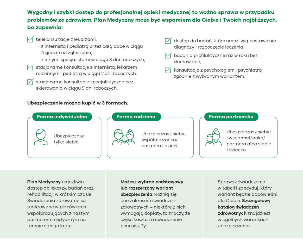 Plan Medyczny daje dostęp do lekarzy, badań i konsultacji wtedy, gdy ich potrzebujesz — a nie wtedy, gdy zwolni się miejsce w kolejce. Chroni Twój czas, zdrowie i spokój, a często także Twój dochód.