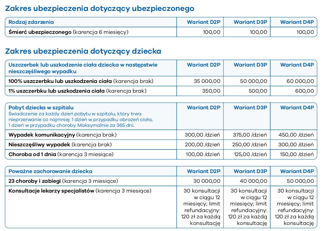 Jedna składka chroniąca wszystkie dzieci. Środki na leczenie, rehabilitację i specjalistów w razie choroby lub wypadku dziecka, bez nagłego obciążania domowego budżetu.